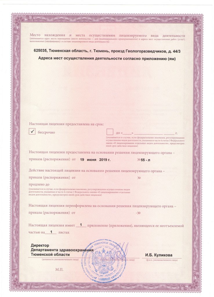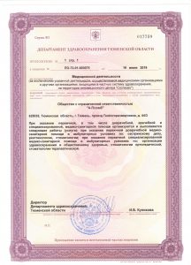 Лицензия ООО «А-Пломб» выдана на осуществление медицинской деятельности № ЛО -72-01-003075 от 19 июня 2019 года на срок: бессрочно (выдана Департаментом здравоохранения Тюменской области (адрес: г. Тюмень, ул. Малыгина, д. 48 тел. 55-78-00))